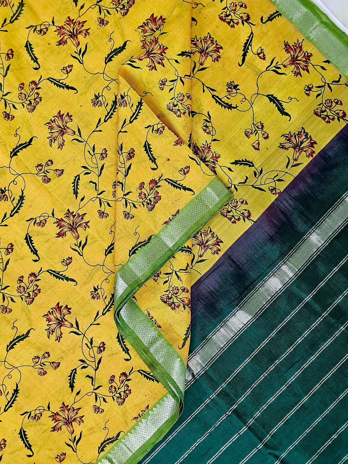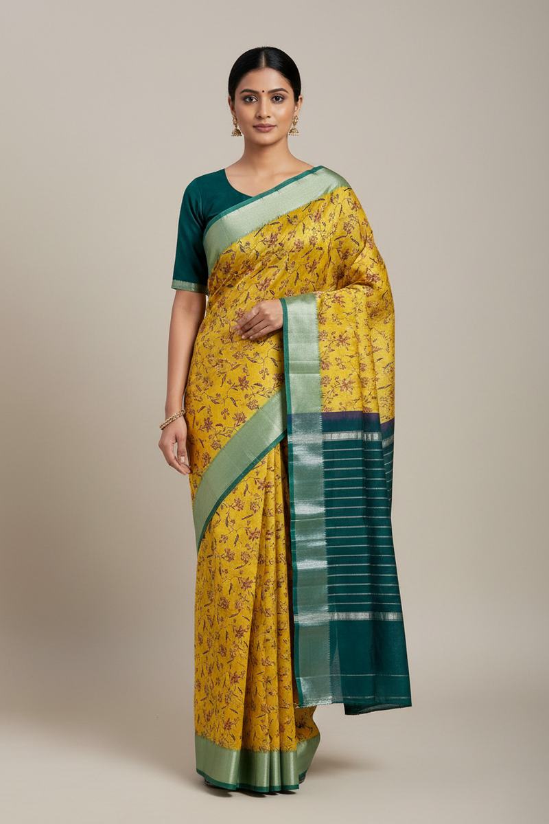 Manjari – Yellow & Green Handloom Mangalagiri Silk Cotton Saree with Floral Print